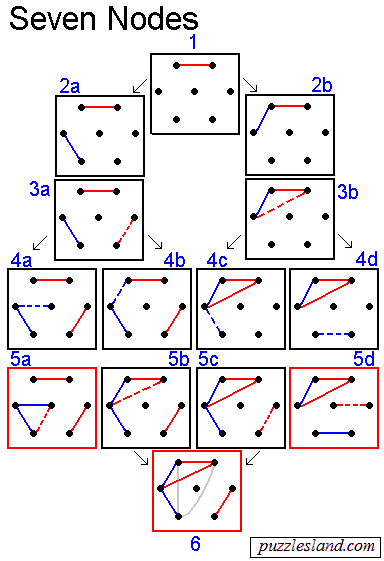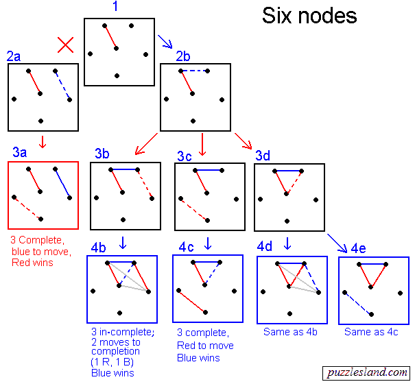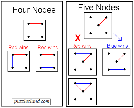 Red (the first player) cannot fail to win in the case of 4, For 5 nodes, Blue (the second player) can make either a winning or losing move on his first chance. ![]() |